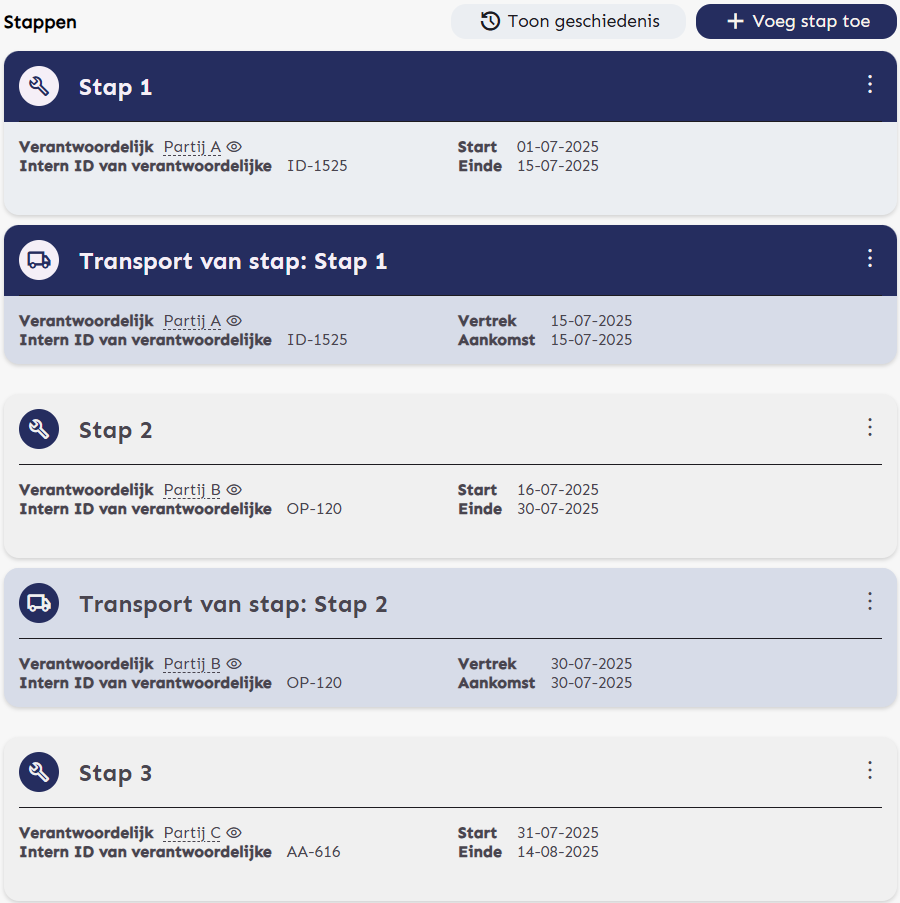 - Per Asset kunnen er stakeholders worden toegevoegd. De partijen die worden toegevoegd kunnen enkel inzien en status updates plaatsen.