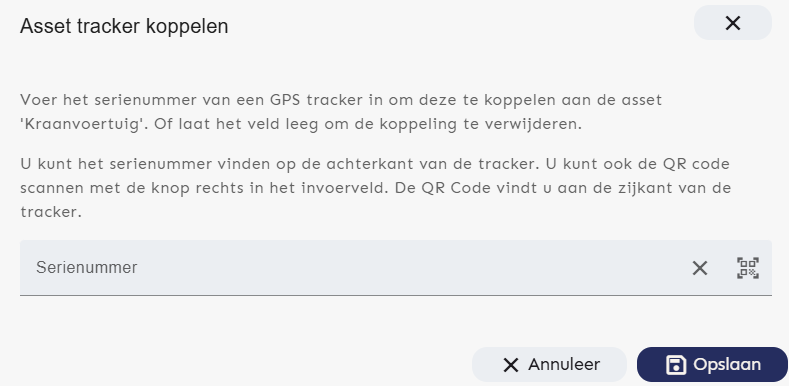 Het serienummer staat op de GPS-tracker. Door het serienummer in te vullen, wordt de GPS-tracker gekoppeld aan de asset.