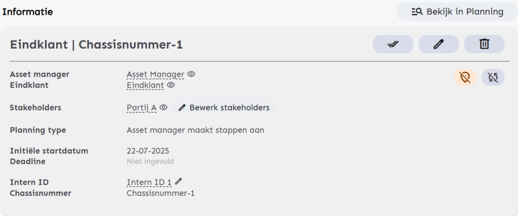 - Bovendien kun je op ‘Bekijk in Planning’ klikken. Je navigeert dan direct naar de Planning pagina, waar deze asset tijdelijk gemarkeerd wordt.